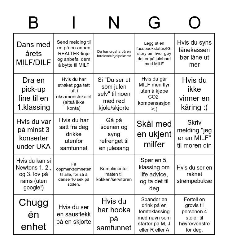 This bingo card has a free space and 24 words: Få oppmerksomheten til alle, for så å danse 10 sek på stolen., Hvis du ser en sausflekk på en skjorte, Si "Du ser ut som julen selv" til noen med rød kjole/skjorte, Chugg én enhet, Hvis du syns lånekassen bør låne ut mer, Dans med årets MILF/DILF, Dra en pick-up line til en 1.klassing, Send melding til en på en annen REALTEK-linje og anbefal dem å bytte til MILF, Skål med en ukjent milfer, Komplimenter maten til kokken/servitøren, Hvis du går MILF men flyr uten å kjøpe CO2-kompensasjon >:(, Hvis du var på minst 3 konserter under UKA, Spør en 5. klassing om life advice, og ta det til deg, Hvis du ser en raknet strømpebukse, Hvis du har strøket pga tett luft i eksamenslokalet (altså ikke konta), Spander en drink på en femteklassing med navn som starter på M, J eller R eller A, Skriv melding "jeg er en MILF" til moren din, Du har crusha på en foreleser/hjelpelærer, Hvis du ikke vinner en kåring :(, Hvis du har satt fra deg drikke utenfor samfunnet, Fortell en grovis til personen 4 stoler til høyre/venstre for deg., Hvis du kan si Newtons 1. 2., og 3. lov på rams (uten google!), Legg ut en facebookstatus/IG-story om hvor gøy det er på julebord med MILF and Hvis du har hooka på samfunnet.