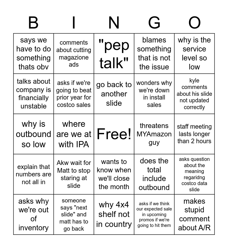 This bingo card has a free space and 24 words: Akw wait for Matt to stop staring at slide, someone says "next slide" and matt has to go back, go back to another slide, asks why we're out of inventory, why is the service level so low, says we have to do something thats obv, talks about company is financially unstable, comments about cutting magazione ads, threatens MYAmazon guy, wants to know when we'll close the month, wonders why we're down in install sales, why is outbound so low, does the total include outbound, asks question about the meaning regaridng costco data slide, asks if we're going to beat prior year for costco sales, asks if we think our expected sale in upcoming promos if we're going to hit them, staff meeting lasts longer than 2 hours, "pep talk", kyle comments about his slide not updated correctly, where are we at with IPA, makes stupid comment about A/R, explain that numbers are not all in, blames something that is not the issue and why 4x4 shelf not in country.