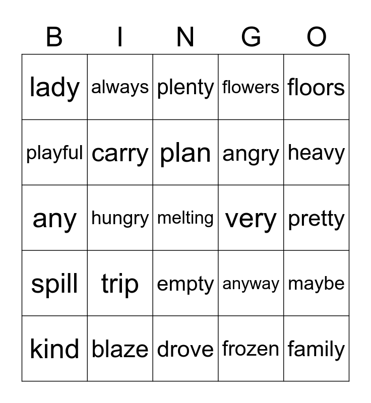 This bingo card has 25 words: trip, drove, plan, kind, floors, lady, playful, always, very, empty, angry, any, anyway, maybe, carry, family, pretty, plenty, heavy, hungry, melting, blaze, spill, flowers and frozen.
