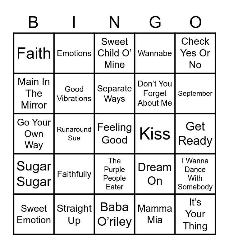 This bingo card has 114 words: You’re The One That I Want, You’re So Vain, You Can’t Hurry Love, Yakety Yak, What’s Love Got To Do With It, We Didn’t Start The Fire, Wannabe, Vogue, Under Pressure, Twistin’ The Night Away, Twist And Shout, Tiny Dancer, Time After Time, Thunderstruck, Thriller, Think, The Purple People Eater, The Longest Time, The Best, The Beat Goes On, Sweet Emotion, Sweet Child O’ Mine, Sweet Caroline, Sway, Summer Of ’69, Sugar Sugar, Straight Up, Stay, Start Me Up, Sherry, September, Separate Ways, Runaround Sue, Respect, Remember The Time, Rebel Rebel, Purple Haze, Old Time Rock And Roll, Oh, Pretty Woman, My Girl, More Than A Woman, Modern Love, Message In A Bottle, Material Girl, Maneater, Man! I Feel Like A Woman!, Mamma Mia, Main In The Mirror, Let’s Stay Together, Leaving, On A Jet Plane, La Bamba, Kiss, Just Like Heaven, Joy To The World, Johnny B Goode, Jailhouse Rock, It’s Your Thing, Islands In The Stream, I’m A Believer, I Want You Back, I Wanna Dance With Somebody, I Walk The Line, I Got You Babe, I Can’t Get No Satisfaction, Hotel California, Hit Me With Your Best Shot, Hey Jude, Good Vibrations, Go Your Own Way, Girls Just Want To Have Fun, Get Ready, Fun, Fun, Fun, Freedom! ’90, Free Ride, Forever And Ever, Amen, Feeling Good, Faithfully, Faith, Everywhere, Everybody Wants To Rule The World, Escape, Emotions, Edge Of Seventeen, Dream On, Don’t You Forget About Me, Don’t Stop Believin’, Don’t Go Breaking My Heart, Don’t Bring Me Down, December 1963, Dancing Queen, Crazy, Come Together, Come Fly With Me, Check Yes Or No, Cecilia, Call Me Maybe, Burning Love, Build Me Up Buttercup, Brown Eyed Girl, Born To Run, Boot Scootin’ Boogie, Bohemian Rhapsody, Beyond The Sea, Best Of My Love, Beautiful Day, Bang The Drum All Day, Baby I Need Your Loving, Baba O’riley, Amarillo By Morning, Ain’t Too Proud To Beg, Ain’t No Mountain High Enough, Africa, 9 To 5 and 1999.