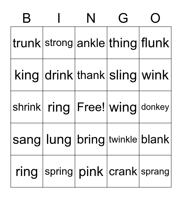 This bingo card has a free space and 24 words: lung, spring, thank, ring, flunk, trunk, king, strong, wing, bring, sling, shrink, twinkle, blank, drink, crank, donkey, ankle, wink, ring, sprang, sang, thing and pink.
