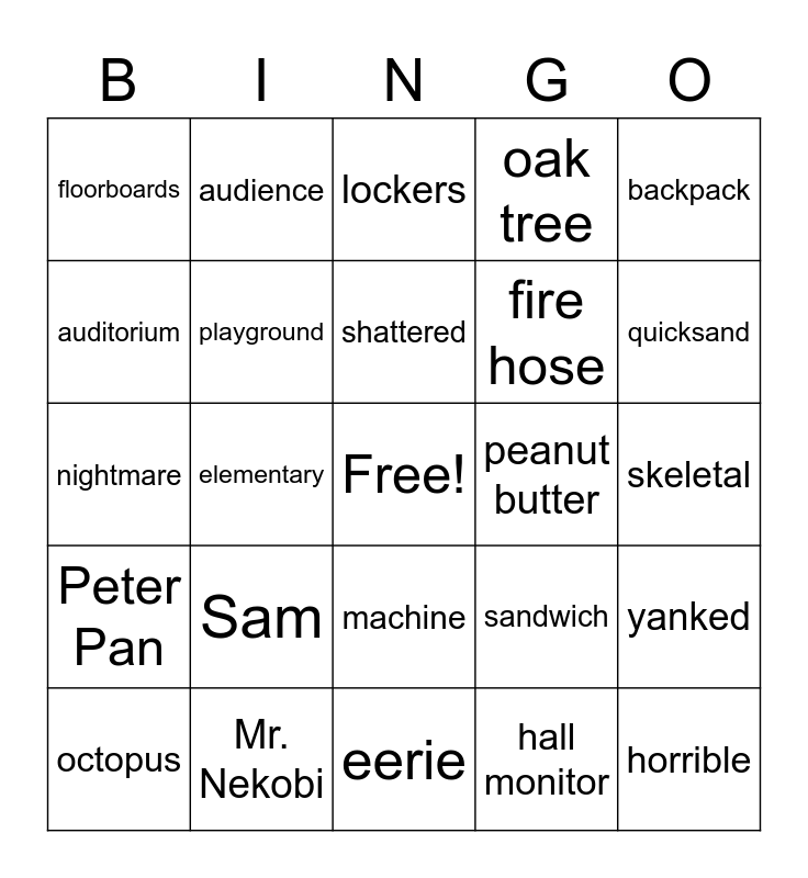 This bingo card has a free space and 24 words: Sam, Mr. Nekobi, shattered, octopus, backpack, floorboards, auditorium, audience, peanut butter, machine, fire hose, nightmare, sandwich, yanked, playground, hall monitor, skeletal, lockers, quicksand, elementary, horrible, Peter Pan, oak tree and eerie.