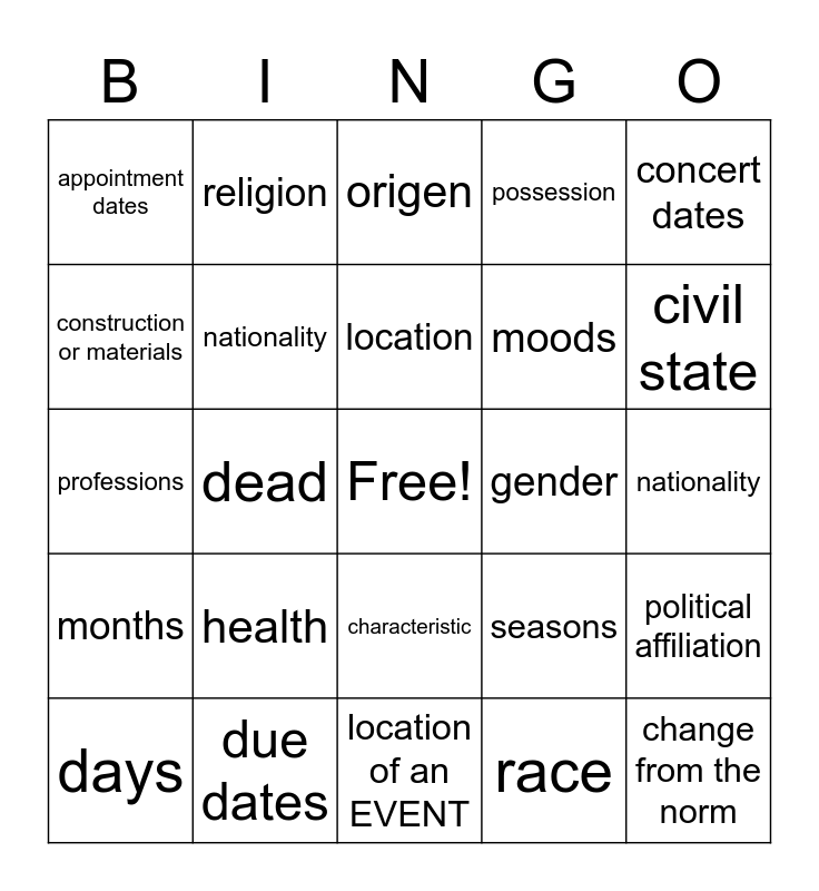 This bingo card has a free space and 24 words: health, due dates, location, days, concert dates, appointment dates, construction or materials, religion, gender, characteristic, moods, professions, seasons, political affiliation, nationality, race, nationality, origen, civil state, dead, change from the norm, months, possession and location of an EVENT.