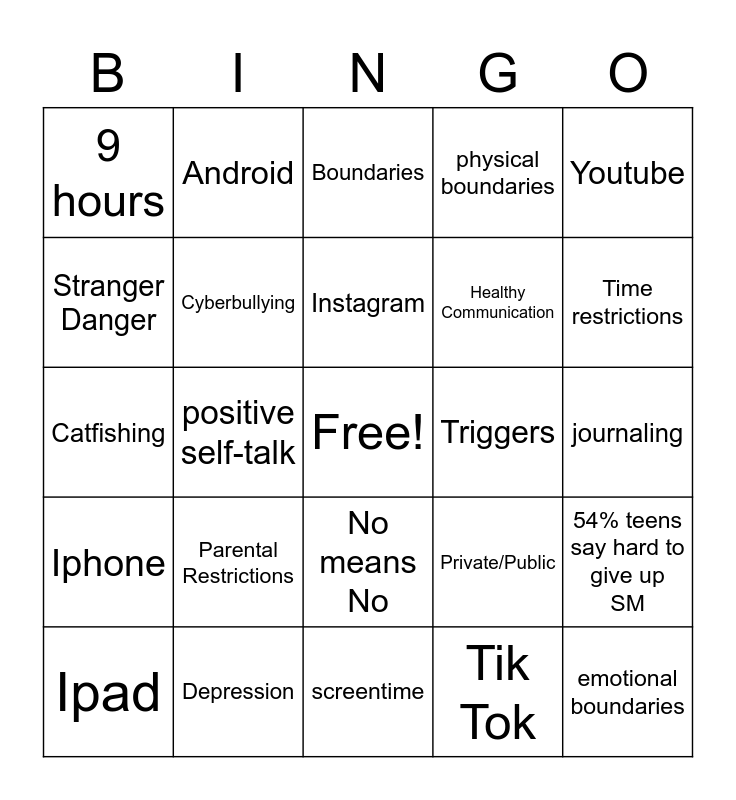This bingo card has a free space and 24 words: Parental Restrictions, Depression, Instagram, Ipad, Youtube, 9 hours, Stranger Danger, Android, Triggers, No means No, Healthy Communication, Catfishing, Private/Public, 54% teens say hard to give up SM, Cyberbullying, Tik Tok, journaling, Boundaries, Time restrictions, positive self-talk, emotional boundaries, Iphone, physical boundaries and screentime.