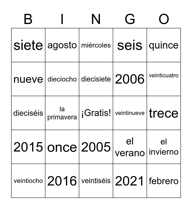 This bingo card has a free space and 79 words: lunes, martes, miércoles, jueves, viernes, sábado, domingo, uno, dos, tres, cuatro, cinco, seis, siete, ocho, nueve, diez, once, doce, trece, catorce, quince, dieciséis, diecisiete, dieciocho, diecinueve, veinte, veintiuno, veintidós, veintitrés, veinticuatro, veinticinco, veintiséis, veintisiete, veintiocho, veintinueve, treinta, treinta y uno, enero, febrero, marzo, abril, mayo, junio, julio, agosto, septiembre, octubre, noviembre, diciembre, el invierno, la primavera, el verano, el otoño, dos mil, 2001, 2002, 2003, 2004, 2005, 2006, 2007, 2008, 2009, 2010, 2011, 2012, 2013, 2014, 2015, 2016, 2017, 2018, 2019, 2020, 2021, 2022, 2023 and cumpleaños.