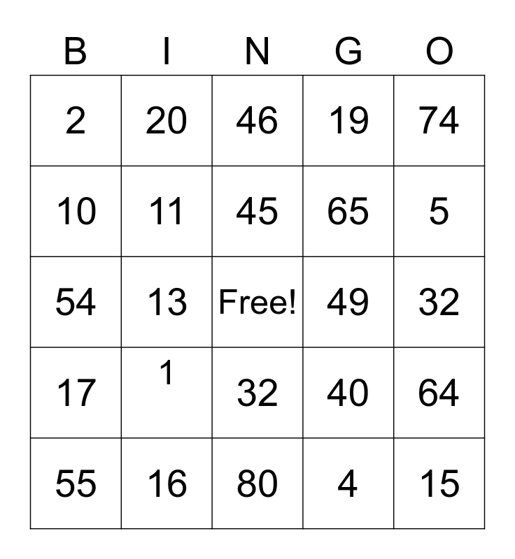 This bingo card has a free space and 24 words: 1, 16, 45, 55, 74, 2, 10, 20, 49, 32, 65, 54, 40, 64, 11, 4, 32, 46, 5, 13, 15, 17, 19 and 80.