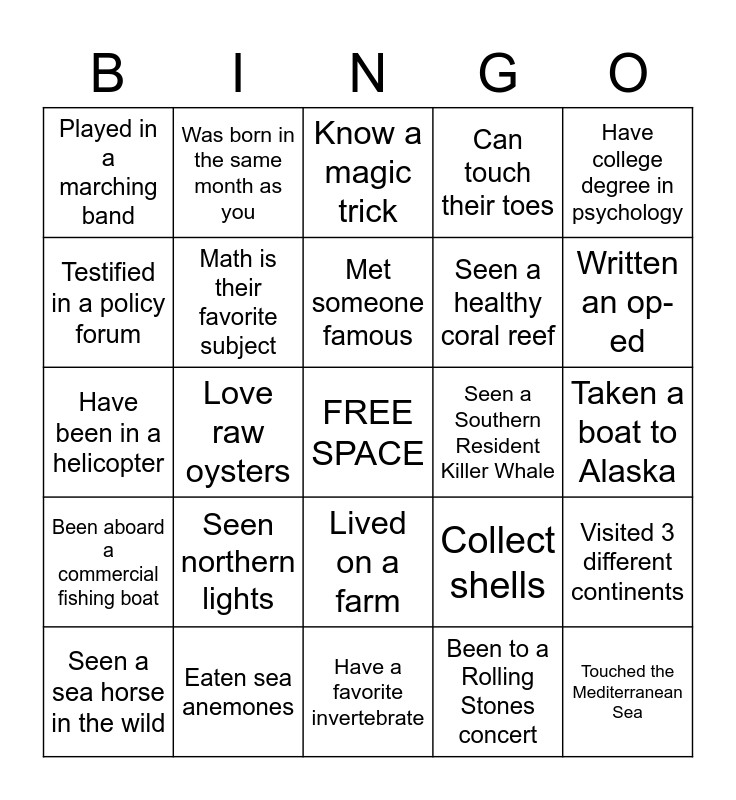 This bingo card has a free space and 29 words: Seen a sea horse in the wild, Caught a wild salmon, Love raw oysters, Grew up more than 1000km from the ocean, Played in a marching band, Know a magic trick, Math is their favorite subject, Seen northern lights, Seen a Southern Resident Killer Whale, Eaten sea anemones, Taken a boat to Alaska, Touched the Mediterranean Sea, Have a favorite invertebrate, Been to a Rolling Stones concert, Written an op-ed, Have been scuba diving, Lived on a farm, Been aboard a commercial fishing boat, Have college degree in psychology, Have been in a helicopter, Collect shells, Love to cook, Seen a healthy coral reef, Testified in a policy forum, Can touch their toes, Was born in the same month as you, Visited 3 different continents, Met someone famous and Taken Amtrak or traveled between cities by train.
