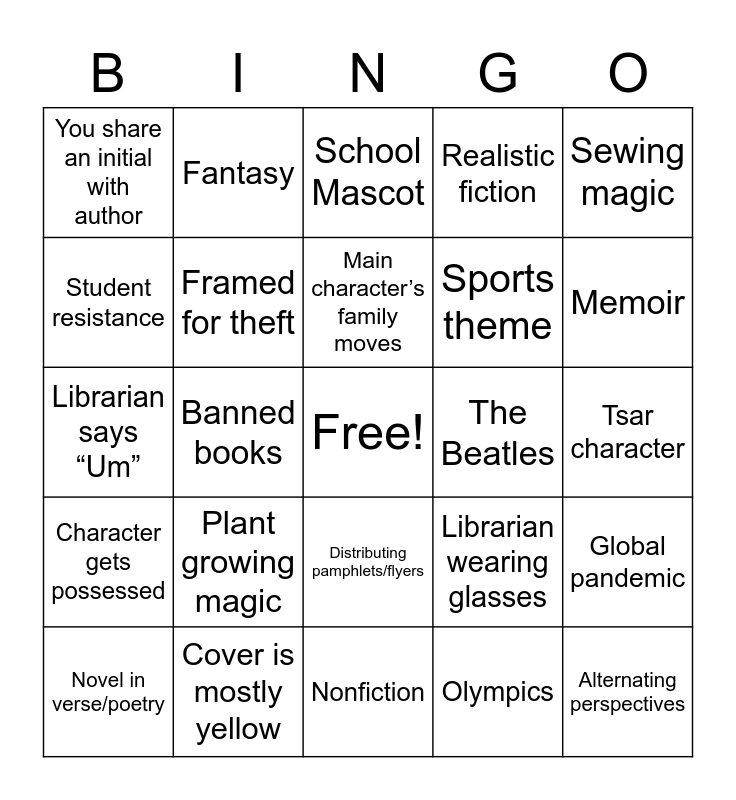 This bingo card has a free space and 71 words: Graphic Novel, Fantasy, Mystery, Romance, Nonfiction, Humor/funny, Realistic fiction, Apocalypse fiction, Sports theme, Adventure, Novel in verse/poetry, Historical fiction, Memoir, You share an initial with author, You share an initial with main character, Librarian says “Um”, Librarian wearing glasses, Sewing magic, Undead/Living Dead, Tsar character, Plant growing magic, Alternating perspectives, Global pandemic, Road trip, Florida, Inspired by another book, Matchmaker, Coding contest, Student enters competition, Friend-matching app, Cover is mostly yellow, Exclamation point in title, Track and field, Civil Rights, Olympics, Protest, World War II Fiction, Set in Germany, Student resistance, Character is arrested, Distributing pamphlets/flyers, Voodoo, Character gets possessed, Parade, Cover has colorful feathers, Softball, Softball mitt on cover, Framed for theft, All-Black girls team, Headphones on cover, Set on reservation, Music lover, The Beatles, Bullying, Cover mostly pink, K-drama, Main character’s family moves, Set in South Korea, Main character is an actor, Fake relationship, Cover mostly black and white, Censorship, Banned books, Reading group, Potato on cover, Hot dog plot point, School Mascot, Set in Idaho, Blizzard, Coast Guard and Oil tanker.