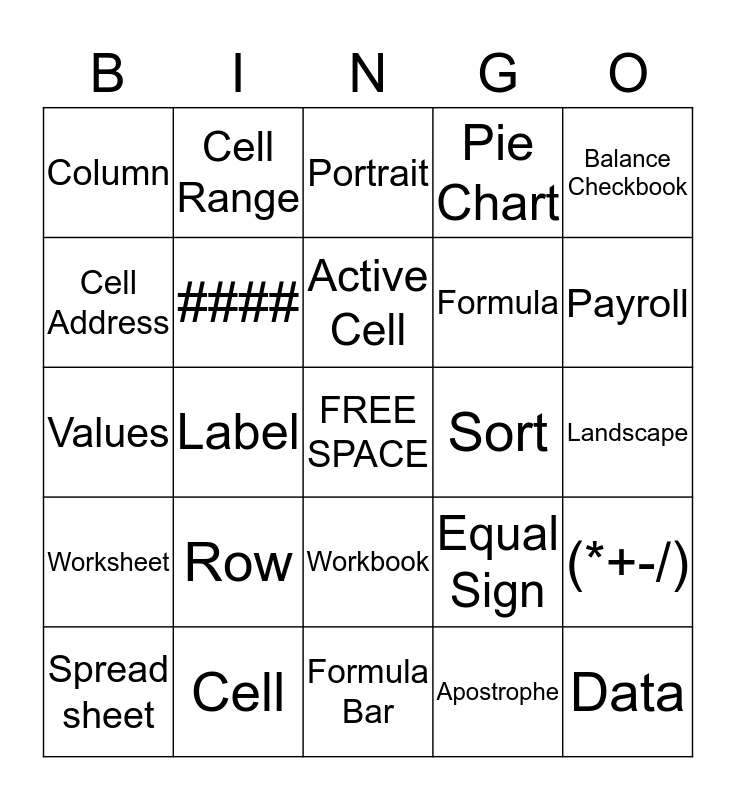 This bingo card has a free space and 24 words: Row, Cell, Active Cell, Spread sheet, Balance Checkbook, Column, Cell Address, Cell Range, Sort, Workbook, Formula, Values, Equal Sign, (*+-/), ####, Apostrophe, Landscape, Portrait, Payroll, Label, Data, Worksheet, Pie Chart and Formula Bar.