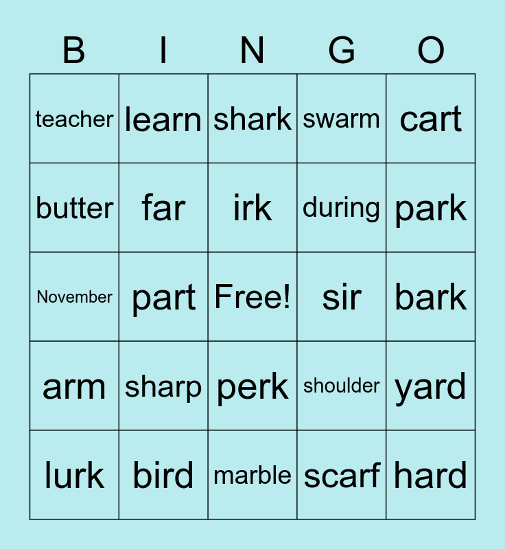 This bingo card has a free space and 24 words: sharp, bird, irk, lurk, cart, teacher, butter, learn, sir, perk, during, November, shoulder, yard, far, scarf, bark, shark, park, part, hard, arm, swarm and marble.