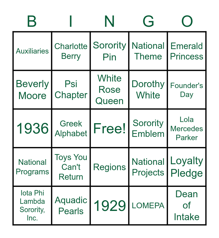This bingo card has a free space and 24 words: Toys You Can't Return, Aquadic Pearls, White Rose Queen, Iota Phi Lambda Sorority, Inc., Emerald Princess, Auxiliaries, Beverly Moore, Charlotte Berry, Sorority Emblem, Regions, Dorothy White, 1936, National Projects, Loyalty Pledge, Psi Chapter, LOMEPA, Lola Mercedes Parker, Sorority Pin, Founder's Day, Greek Alphabet, Dean of Intake, National Programs, National Theme and 1929.