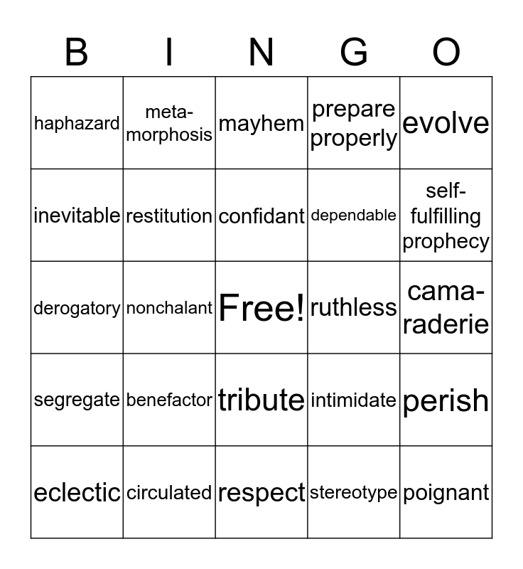 This bingo card has a free space and 24 words: benefactor, circulated, confidant, eclectic, evolve, haphazard, inevitable, meta- morphosis, ruthless, tribute, dependable, derogatory, intimidate, perish, restitution, stereotype, cama- raderie, mayhem, self- fulfilling prophecy, nonchalant, poignant, segregate, prepare properly and respect.