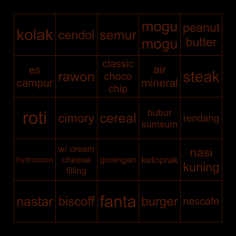 This bingo card has a free space and 24 words: w/ cream cheese filling, biscoff, classic choco chip, nastar, peanut butter, kolak, es campur, cendol, bubur sumsum, gorengan, air mineral, roti, ketoprak, nasi kuning, rawon, burger, rendang, semur, steak, cimory, nescafe, hydrococo, mogu mogu and fanta.