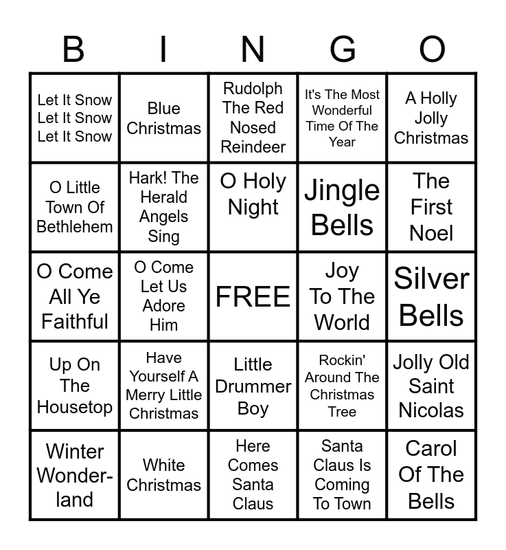 This bingo card has a free space and 34 words: Silent Night, Santa Claus Is Coming To Town, Jingle Bell Rock, Grandma Got Run Over By A Reindeer, Up On The Housetop, Hark! The Herald Angels Sing, A Holly Jolly Christmas, Winter Wonder-land, Blue Christmas, I'll Be Home For Christmas, O Holy Night, Rudolph The Red Nosed Reindeer, Deck The Halls, 12 Days Of Christmas, Joy To The World, The First Noel, White Christmas, O Come All Ye Faithful, Have Yourself A Merry Little Christmas, Rockin' Around The Christmas Tree, Little Drummer Boy, Frosty The Snowman, Let It Snow Let It Snow Let It Snow, Silver Bells, Here Comes Santa Claus, Carol Of The Bells, It's The Most Wonderful Time Of The Year, Away In A Manger, Jingle Bells, O Little Town Of Bethlehem, O Christmas Tree, O Come Let Us Adore Him, Jolly Old Saint Nicolas and We Wish You A Merry Christmas.