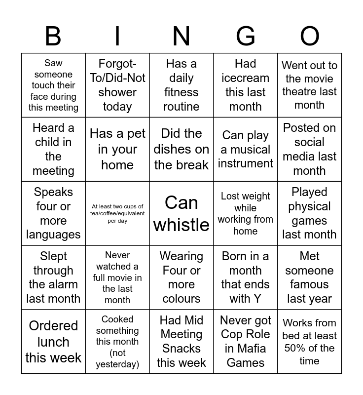 This bingo card has a free space and 25 words: Never watched a full movie in the last month, Had Mid Meeting Snacks this week, Did the dishes on the break, Ordered lunch this week, Went out to the movie theatre last month, Saw someone touch their face during this meeting, Heard a child in the meeting, Forgot-To/Did-Not shower today, Lost weight while working from home, Wearing Four or more colours, Can play a musical instrument, Speaks four or more languages, Born in a month that ends with Y, Met someone famous last year, Has a pet in your home, Read a book last month, Played physical games last month, Has a daily fitness routine, Posted on social media last month, At least two cups of tea/coffee/equivalent per day, Works from bed at least 50% of the time, Cooked something this month (not yesterday), Slept through the alarm last month, Had icecream this last month and Never got Cop Role in Mafia Games.