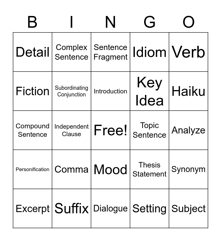 This bingo card has a free space and 98 words: Adjective, Adverb, Analysis, Analyze, Antonym, Apostrophe, Author’s Point of View, Author’s Purpose, Bibliography, Cause, Character, Characterization, Claim, Comma, Compare, Complex Sentence, Compound Sentence, Compound word, Conclusion, Conflict, Conjunction, Context, Contrast, Coordinating Conjunction, Dependent Clause, Detail, Dialogue, Effect, Event, Evidence, Excerpt, Fiction, Figurative Language, Genre, Haiku, Homophone, Idiom, Imagery, Independent Clause, Infer, Inference, Introduction, Key Idea, Memoir, Metaphor, Mood, Narrator, Nonfiction, Noun, Novel, Object Pronoun, Onomatopoeia, Part of speech, Personal narrative, Parts of Speech, Personal Narrative, Personification, Plot, Plot Twist, Poetry, Predicate, Prefix, Problem, Pronoun, Repetition, Rhyme, Rhythm, Root, Run-on Sentence, Sensory Details, Sentence Fragment, Sequence, Setting, Short Story, Signal Words, Simile, Solution, Speaker, Stanza, Subject, Subject pronoun, Subordinating Conjunction, Suffix, Summarize, Summary, Suspense, Syllable, Symbol, Synonym, Tense, Theme, Thesis Statement, Tone, Topic, Topic Sentence, Transition, Verb and Verse.