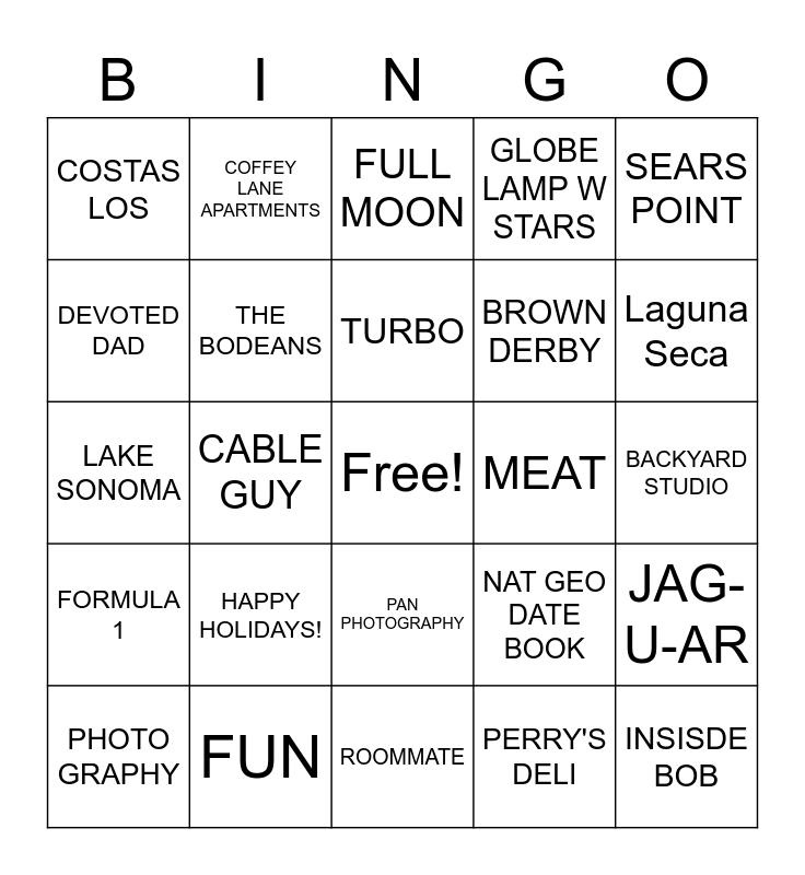 This bingo card has a free space and 83 words: SALS, SUGARLOAF CAMPING, FULL MOON, DINNER CLUB, WRAP AROUND PORCH, AUTO RACING, PURPLE, MOON FLOWERS, PILLSBURY CABIN, THE LAB, SOFTBALL TEAM, HEWITT STREET, THE BODEANS, MEAT, GARDENING, COSTAS LOS, PHOTO GRAPHY, DEVOTED DAD, OLD CHEVY, MORLEY WAY, SCREW YOUR NEIGHBOR, BROWN DERBY, INSISDE BOB, OUTSIDE BOB, CABLE GUY, HANDYMAN, YOSEMITE, AHWAHNEE DINNER, 12 DAYS OF CHRISTMAS, BOBOLI PIZZA, HAPPY HOLIDAYS!, HOMEMADE CHRISTMAS CARDS, HOUSEBOAT, LAKE SONOMA, CAMPING, SHOES, ROOMMATE, LOYAL FRIEND, Laguna Seca, FORMULA 1, MONTE CRISTO, BLUE VAN, DINO-SAURS, CHASING FIRETRUCKS, DARKROOM, THE WHO, COFFEY LANE APARTMENTS, 7 & 7, BOURBON 7-UP & GINGER ALE, BONFIRE, NAT GEO DATE BOOK, GLOBE LAMP W STARS, BACKYARD STUDIO, GENEROSITY, ROBERT, DINNER FOR 3, JUST 3 MORE BITES, FRAMILY, FUN, MUSH- ROOMS, RED WINE, WESTSIDE ROAD, BLACK & WHITE, SEARS POINT, PORCHE-A, JAG-U-AR, CARS, AYRTON SENNA, IMSA RACING, MARK MARTIN, NASCAR, ROBBY GORDON, CYCLING, PAN PHOTOGRAPHY, PERRY'S DELI, LASAGNA, TUMBLER COCKTAILS, TURBO, HELPING YOUTH, GUARD A LIFE, MOTHRA, PURPLE SUN-GLASSES and ZIN.