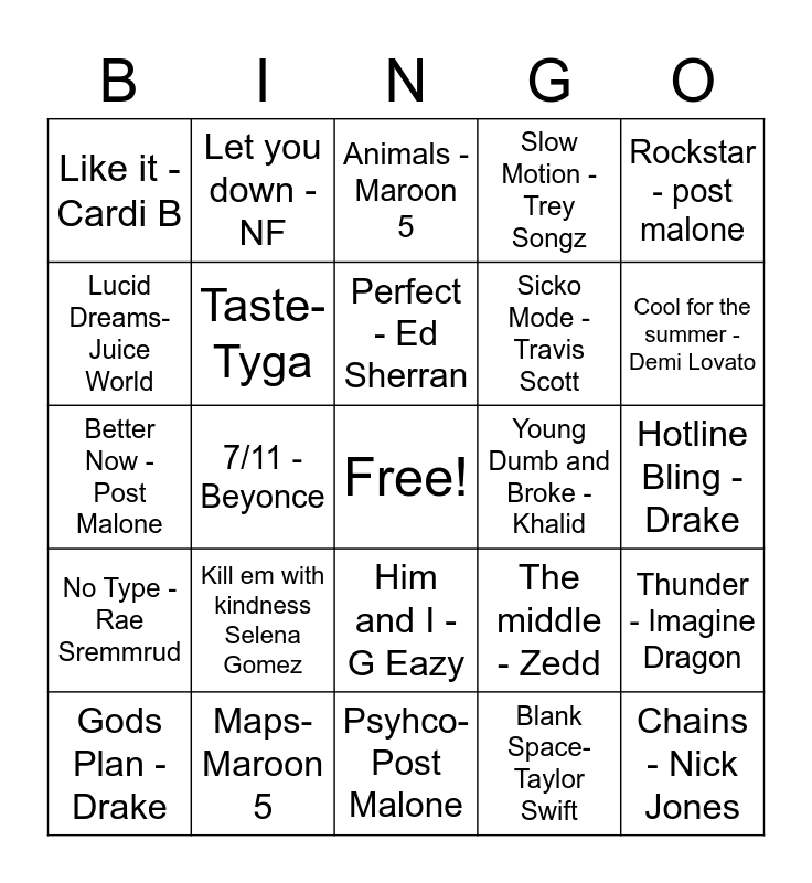 This bingo card has a free space and 24 words: Kill em with kindness Selena Gomez, Maps- Maroon 5, Perfect - Ed Sherran, Gods Plan - Drake, Rockstar - post malone, Like it - Cardi B, Lucid Dreams- Juice World, Let you down - NF, Young Dumb and Broke - Khalid, Him and I - G Eazy, Sicko Mode - Travis Scott, Better Now - Post Malone, The middle - Zedd, Thunder - Imagine Dragon, Taste- Tyga, Blank Space- Taylor Swift, Hotline Bling - Drake, Animals - Maroon 5, Cool for the summer - Demi Lovato, 7/11 - Beyonce, Chains - Nick Jones, No Type - Rae Sremmrud, Slow Motion - Trey Songz and Psyhco- Post Malone.