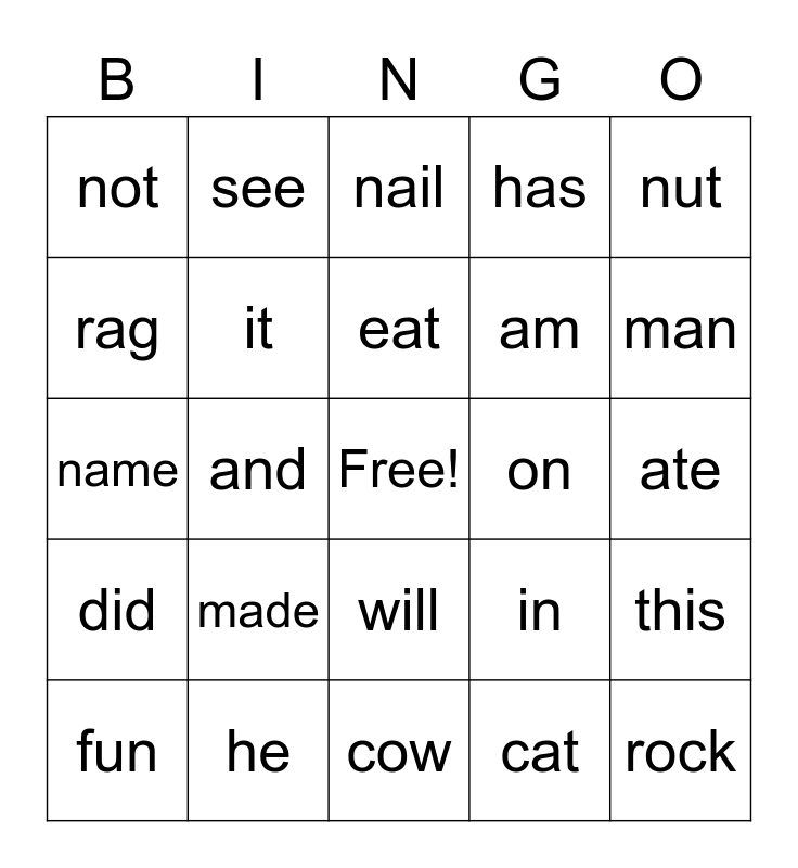 This bingo card has a free space and 24 words: made, he, eat, fun, nut, not, rag, see, on, will, am, name, in, this, it, cat, ate, nail, man, and, rock, did, has and cow.