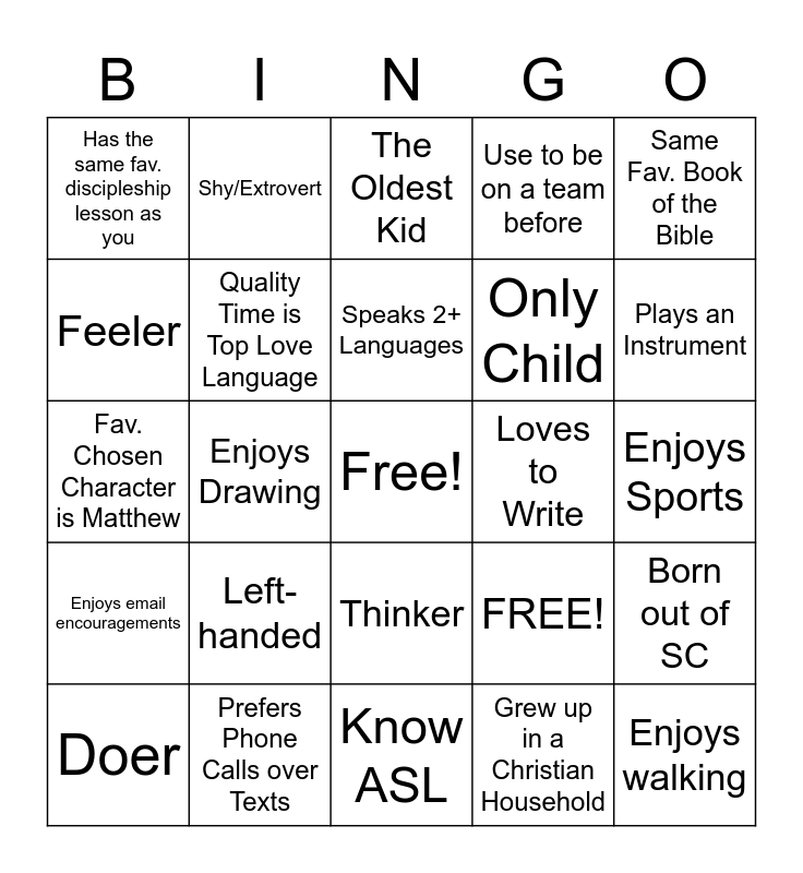 This bingo card has a free space and 25 words: Left-handed, Know ASL, Speaks 2+ Languages, Doer, Same Fav. Book of the Bible, Has the same fav. discipleship lesson as you, Feeler, Shy/Extrovert, Loves to Write, Thinker, Only Child, Fav. Chosen Character is Matthew, FREE!, Born out of SC, Quality Time is Top Love Language, Fav. Worship Artist is Phil Wickham, Enjoys Sports, The Oldest Kid, Plays an Instrument, Enjoys Drawing, Enjoys walking, Prefers Phone Calls over Texts, Enjoys email encouragements, Use to be on a team before and Grew up in a Christian Household.