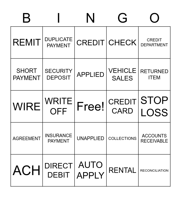 This bingo card has a free space and 28 words: ACCOUNTS RECEIVABLE, OVERPAYMENT, VEHICLE SALES, RENTAL, SHORT PAYMENT, CREDIT, DUPLICATE PAYMENT, AGREEMENT, CREDIT CARD, ACH, WIRE, CHECK, DIRECT DEBIT, AUTO APPLY, RETURNED ITEM, REJECTION, INSURANCE PAYMENT, SECURITY DEPOSIT, APPLIED, UNAPPLIED, REMIT, ARSS, RECONCILIATION, WRITE OFF, STOP LOSS, COLLECTIONS, CREDIT DEPARTMENT and SMALL BALANCE.