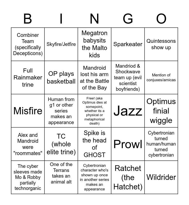 This bingo card has a free space and 24 words: TC (whole elite trine), One of the Terrans takes an animal alt, Mandroid lost his arm at the Battle of the Bay, The cyber sleeves made Mo & Robby partially technorganic, Quintessons show up, Combiner Team (specifically Decepticons), Full Rainmaker trine, Skyfire/Jetfire, Jazz, Spike is the head of GHOST, Mandriod & Shockwave team up (evil scientist boyfriends), Misfire, Prowl, Cybertronian turned human/human turned cybertronian, OP plays basketball, Ratchet (the Hatchet), Optimus finial wiggle, Megatron babysits the Malto kids, Mention of conjuxes/amicas, Human from g1 or other series makes an appearance, Wildrider, Alex and Mandroid were "roommates", Sparkeater and Cybertronian character who's shown up once in another series makes an appearance.