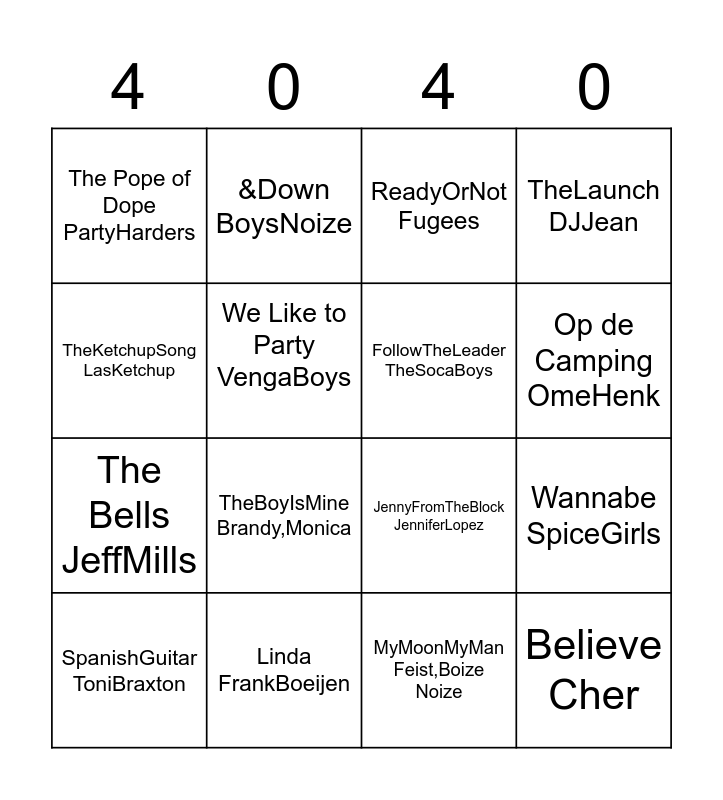 This bingo card has 26 words: 7 Days CraigDavid, Blue (Da Ba Dee) I'm Blue, Op de Camping OmeHenk, PokerFace LadyGaGa, TheKetchupSong LasKetchup, The Pope of Dope PartyHarders, We Like to Party VengaBoys, &Down BoysNoize, MyMoonMyMan Feist,Boize Noize, Traag Bizzey, Jozo, Kraantje Pappie, The Bells JeffMills, JennyFromTheBlock JenniferLopez, C.O.S.T.A COSTA!, HungUp Madonna, Wannabe SpiceGirls, BabyOneMoreTime BritneySpears, TheLaunch DJJean, Believe Cher, ReadyOrNot Fugees, SpanishGuitar ToniBraxton, TheBoyIsMine Brandy,Monica, MysteriousGirl PeterAndre, Linda FrankBoeijen, Linda, Dit is je Verjaardag CadeautjeVoorJou, FollowTheLeader TheSocaBoys and BeterAlsJeDanst K3.