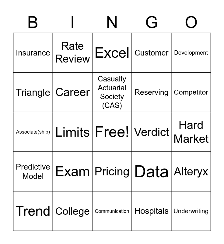 This bingo card has a free space and 24 words: Exam, College, Casualty Actuarial Society (CAS), Trend, Development, Insurance, Triangle, Rate Review, Verdict, Pricing, Reserving, Associate(ship), Data, Alteryx, Career, Hospitals, Hard Market, Excel, Competitor, Limits, Underwriting, Predictive Model, Customer and Communication.