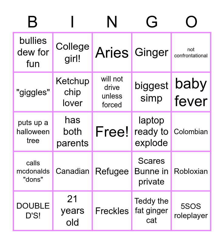 This bingo card has a free space and 24 words: Canadian, 21 years old, will not drive unless forced, DOUBLE D'S!, not confrontational, bullies dew for fun, "giggles", College girl!, laptop ready to explode, Refugee, biggest simp, puts up a halloween tree, Scares Bunne in private, Robloxian, Ketchup chip lover, Teddy the fat ginger cat, Colombian, Aries, baby fever, has both parents, 5SOS roleplayer, calls mcdonalds "dons", Ginger and Freckles.