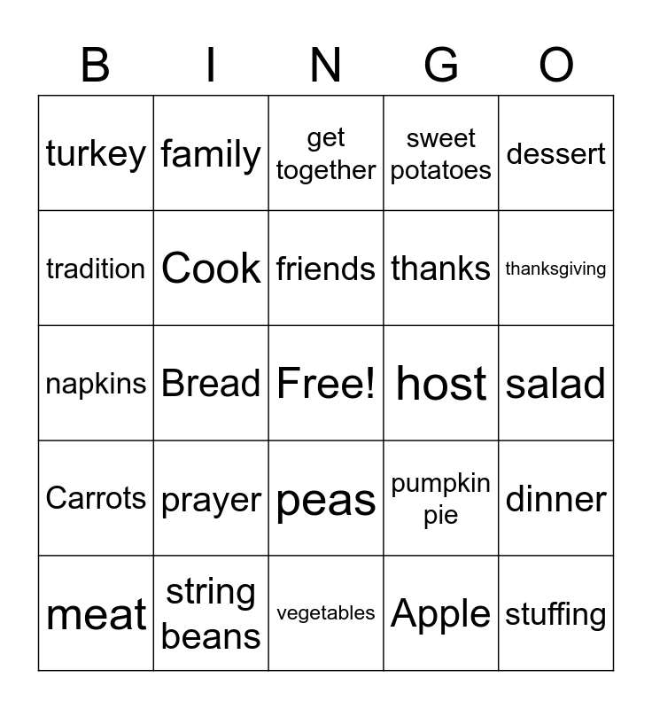 This bingo card has a free space and 32 words: Apple, Autumn, Bread, Butter, Carrots, Cook, dessert, dinner, family, feast, friends, get together, gravy, harvest, host, mash potatoes, meat, napkins, peas, prayer, pumpkin pie, rolls, salad, string beans, stuffing, sweet potatoes, thanks, tradition, turkey, vegetables, visit and thanksgiving.
