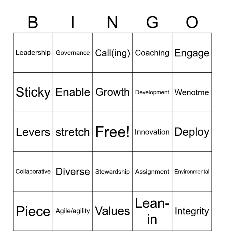 This bingo card has a free space and 57 words: space, Piece, Conversation, Leadership, Values, Empower, Enable, inspire, Development, Adaptive, Coaching, Purpose, Passion, Take-away, Discuss, Reflect, Engage, stretch, Release, Integrity, Innovation, Transformational, Assignment, Call(ing), Differentiate, Growth, Intentional, Discipleship, Wenotme, Humility, Tool, Story, Unlock, Impact, Deploy, Sticky, Refine, Levers, Conflict, Collaborative, Governance, Stewardship, Financial, The chair, Roadmap, Pivot, Diverse, Agile/agility, Tension, Alignment, Vision, Lean-in, Prioritise, Risk identification, Unintended, Environmental and Reputation.