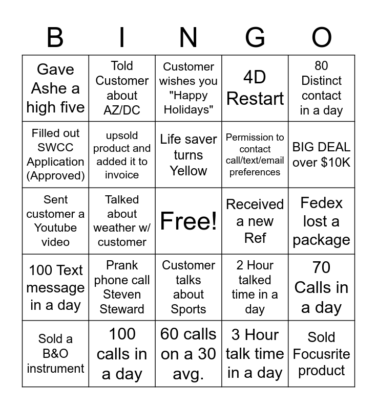 This bingo card has a free space and 24 words: Prank phone call Steven Steward, 100 calls in a day, Life saver turns Yellow, Sold a B&O instrument, 80 Distinct contact in a day, Gave Ashe a high five, Filled out SWCC Application (Approved), Told Customer about AZ/DC, Received a new Ref, Customer talks about Sports, Permission to contact call/text/email preferences, Sent customer a Youtube video, 2 Hour talked time in a day, 70 Calls in a day, upsold product and added it to invoice, 3 Hour talk time in a day, Fedex lost a package, Customer wishes you "Happy Holidays", BIG DEAL over $10K, Talked about weather w/ customer, Sold Focusrite product, 100 Text message in a day, 4D Restart and 60 calls on a 30 avg..
