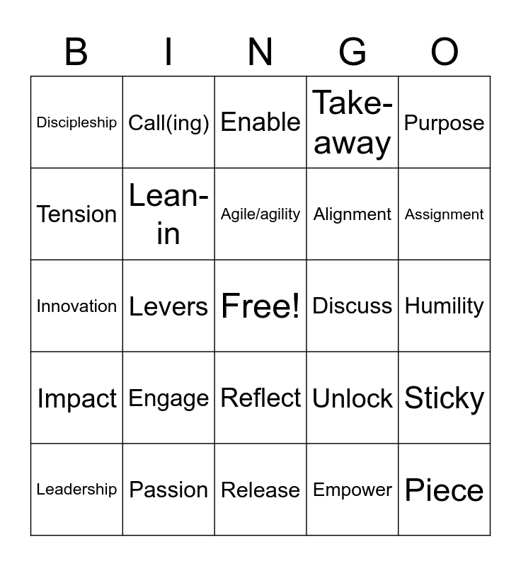 This bingo card has a free space and 43 words: space, Piece, Conversation, Leadership, Values, Empower, Enable, inspire, Purpose, Passion, Take-away, Discuss, Reflect, Engage, stretch, Release, Integrity, Innovation, Transformational, Assignment, Call(ing), Growth, Intentional, Discipleship, Wenotme, Humility, Tool, Story, Unlock, Impact, Deploy, Sticky, Refine, Levers, Roadmap, Pivot, Diverse, Agile/agility, Tension, Alignment, Vision, Lean-in and Prioritise.