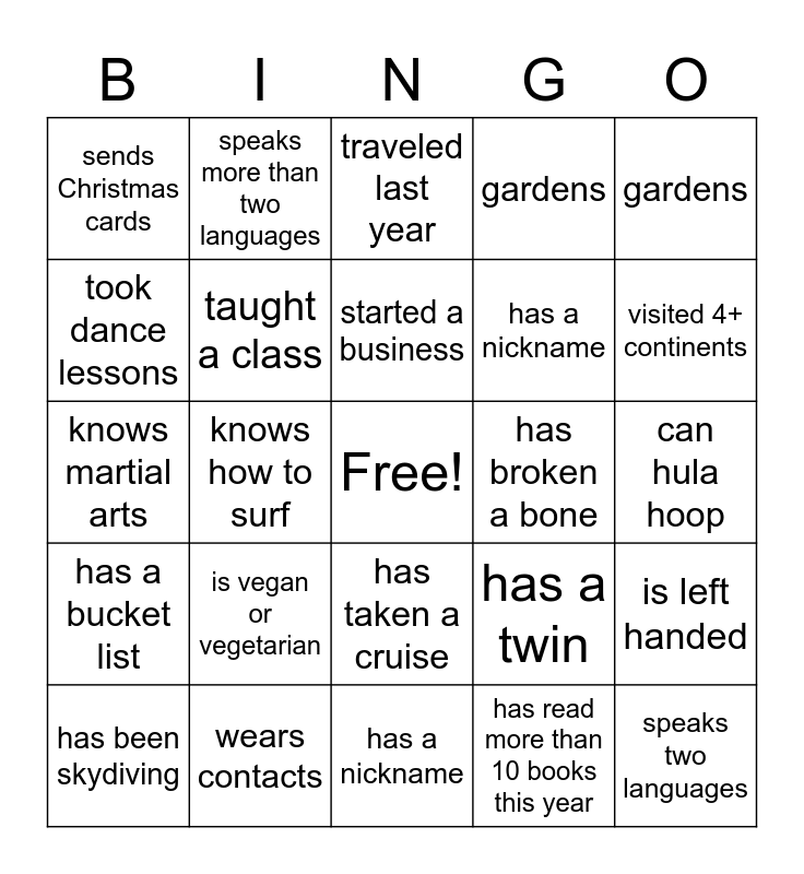 This bingo card has a free space and 29 words: has been skydiving, is a good cook, knows how to surf, has been to the olympics, sends Christmas cards, traveled last year, taught a class, is vegan or vegetarian, has broken a bone, wears contacts, can hula hoop, speaks two languages, has a nickname, has read more than 10 books this year, visited 4+ continents, has a favorite pen, has taken a cruise, has a bucket list, gardens, knows martial arts, has a twin, birthday is on a holiday, has a nickname, took dance lessons, gardens, speaks more than two languages, is left handed, started a business and volunteers.