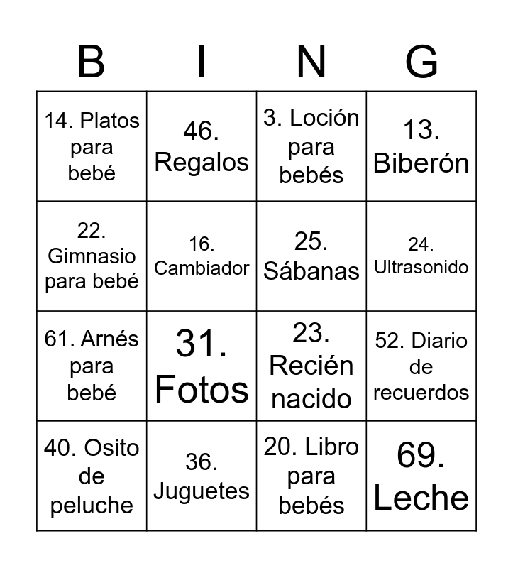 This bingo card has 78 words: 1. Bañera para bebés, 2. Foto álbum, 3. Loción para bebés, 4. Comida para bebé, 5. Papilla, 6. Ropa, 7. Babero, 8. Shampoo para bebé, 9. Mordedera, 10. Taza entrenadora, 11. Camisita, 12. Porta-retrato, 13. Biberón, 14. Platos para bebé, 15. Calcetines, 16. Cambiador, 17. Mamá, 18. Nombres, 19. Humificador, 20. Libro para bebés, 21. Monitor para bebé, 22. Gimnasio para bebé, 23. Recién nacido, 24. Ultrasonido, 25. Sábanas, 26. Mecedora, 27. Tarjeta de regalo, 28. Amor, 29. Azul, 30. Móviles, 31. Fotos, 32. Peluche, 33. Gerber, 34. Toallita, 35. Antojos, 36. Juguetes, 37. Chupón, 38. Hora del baño, 39. Familia, 40. Osito de peluche, 41. Columpio saltarín, 42. Botitas, 43. Abuelo, 44. Papá, 45. Bebé, 46. Regalos, 47. Sonaja, 48. Gorrito, 49. Abuela, 50. Fórmula, 51. Accesorios de baño, 52. Diario de recuerdos, 53. Pañales, 54. Esponjita, 55. Niño, 56. Tapete de juego, 57. Canasta para bebés, 58. Talco para bebés, 59. Esterilizador, 60. Portabebé, 61. Arnés para bebé, 62. Toallas húmedas, 63. Cólico, 64. Zapatitos, 65. Cuna, 66. Pañalera, 67. Silla alta, 68. Nieto, 69. Leche, 70. Corralito, 71. CD de música, 72. Canción de cuna, 73. Andadera, 74. Cigüeña, 75. Mameluco, 76. Coche de bebé, 77. Ropita para bebé and 78. Hora de la siesta.