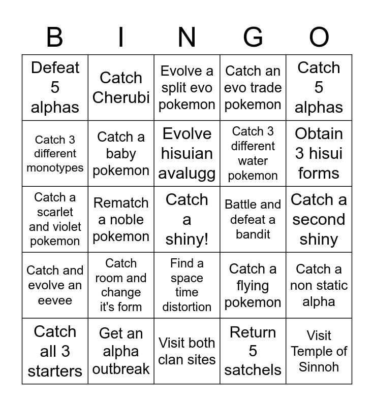 This bingo card has a free space and 24 words: Catch all 3 starters, Catch room and change it's form, Evolve hisuian avalugg, Return 5 satchels, Catch 5 alphas, Defeat 5 alphas, Catch Cherubi, Evolve a split evo pokemon, Battle and defeat a bandit, Catch a second shiny, Catch a scarlet and violet pokemon, Catch a baby pokemon, Catch a flying pokemon, Catch a non static alpha, Catch 3 different monotypes, Get an alpha outbreak, Visit both clan sites, Catch an evo trade pokemon, Obtain 3 hisui forms, Catch and evolve an eevee, Rematch a noble pokemon, Find a space time distortion, Catch 3 different water pokemon and Visit Temple of Sinnoh.