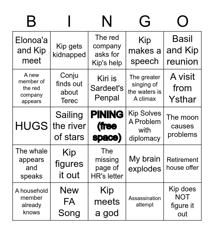 This bingo card has a free space and 24 words: Kip figures it out, New FA Song, Kiri is Sardeet's Penpal, A household member already knows, Basil and Kip reunion, Elonoa'a and Kip meet, A new member of the red company appears, Kip gets kidnapped, Kip Solves A Problem with diplomacy, The missing page of HR's letter, The greater singing of the waters is A climax, HUGS, My brain explodes, Retirement house offer, Conju finds out about Terec, Assassination attempt, The moon causes problems, The red company asks for Kip's help, A visit from Ysthar, Sailing the river of stars, Kip does NOT figure it out, The whale appears and speaks, Kip makes a speech and Kip meets a god.