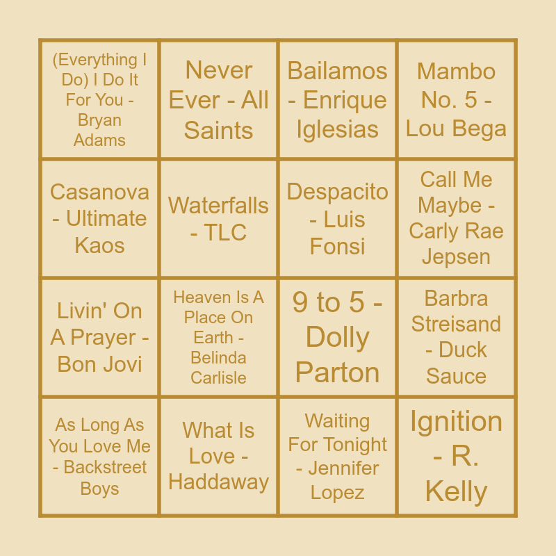 This bingo card has 28 words: Wannabe - Spice Girls, Total Eclipse Of The Heart - Bonnie Tyler, Livin' On A Prayer - Bon Jovi, Mysterious Girl - Peter Andre, Waterfalls - TLC, Bailamos - Enrique Iglesias, Never Ever - All Saints, Ignition - R. Kelly, What Is Love - Haddaway, Sweet Caroline - Neil Diamond, 9 to 5 - Dolly Parton, Mambo No. 5 - Lou Bega, Uptown Girl - Billy Joel, Walk Like An Egyptian - The Bangles, Heaven Is A Place On Earth - Belinda Carlisle, I Think We're Alone Now - Tiffany, I Gotta Feeling - Black Eyed Peas, Despacito - Luis Fonsi, Call Me Maybe - Carly Rae Jepsen, It's All Coming Back To Me Now - Celine Dion, (Everything I Do) I Do It For You - Bryan Adams, MMMBop - Hanson, As Long As You Love Me - Backstreet Boys, Barbra Streisand - Duck Sauce, Waiting For Tonight - Jennifer Lopez, It's Not Unusual - Tom Jones, Casanova - Ultimate Kaos and U Can't Touch This - MC Hammer.