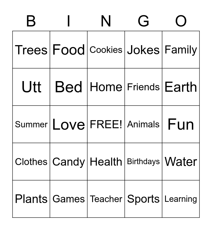 This bingo card has a free space and 24 words: Candy, Games, Home, Plants, Family, Trees, Utt, Food, Animals, Health, Friends, Summer, Birthdays, Water, Bed, Sports, Fun, Cookies, Earth, Love, Learning, Clothes, Jokes and Teacher.