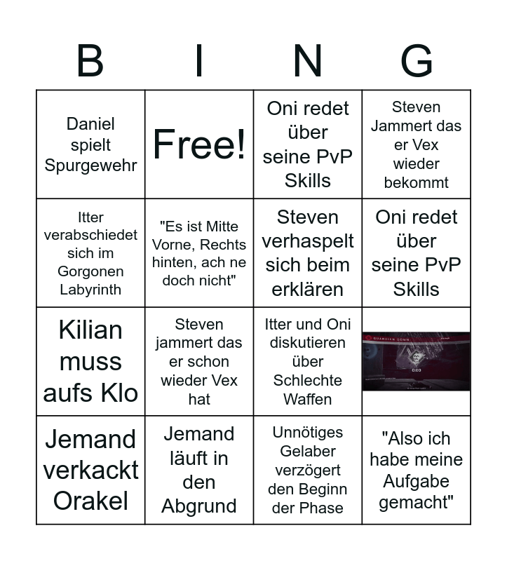 This bingo card has 1 images and 18 words: Itter und Oni diskutieren über Schlechte Waffen, Karo redet während Steven erklärt, Oni redet über seine PvP Skills, "Also ich habe meine Aufgabe gemacht", Itter verabschiedet sich im Gorgonen Labyrinth, Unnötiges Gelaber verzögert den Beginn der Phase, Daniel spielt Spurgewehr, Free!, Kilian muss aufs Klo, Steven jammert das er schon wieder Vex hat, "Es ist Mitte Vorne, Rechts hinten, ach ne doch nicht", Steven verhaspelt sich beim erklären, Jemand läuft in den Abgrund, Jemand verkackt Orakel, Itter vergisst wie VoG geht, Steven Jammert das er Vex wieder bekommt, Oni redet über seine PvP Skills and Daniel spielt Spurgewehr.