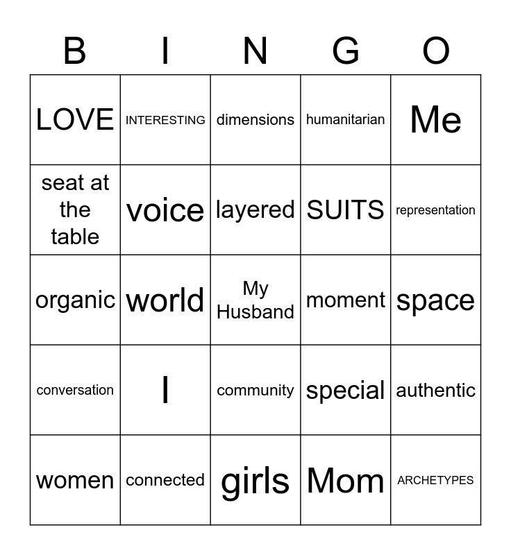 This bingo card has 25 words: I, girls, layered, women, Me, LOVE, seat at the table, INTERESTING, moment, community, SUITS, organic, special, authentic, voice, ARCHETYPES, space, dimensions, representation, world, My Husband, connected, conversation, humanitarian and Mom.