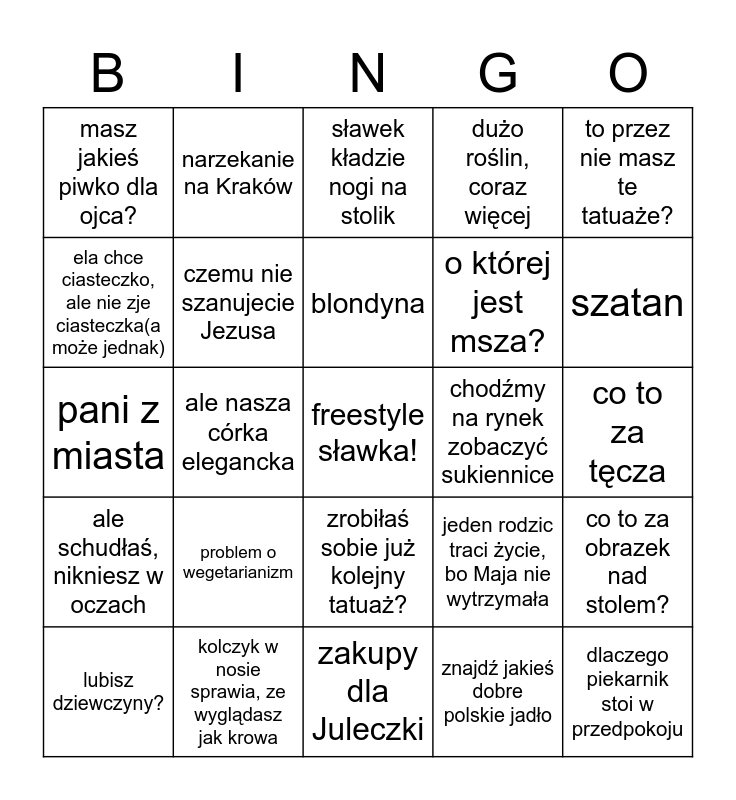 This bingo card has a free space and 24 words: problem o wegetarianizm, kolczyk w nosie sprawia, ze wyglądasz jak krowa, blondyna, lubisz dziewczyny?, to przez nie masz te tatuaże?, masz jakieś piwko dla ojca?, ela chce ciasteczko, ale nie zje ciasteczka(a może jednak), narzekanie na Kraków, chodźmy na rynek zobaczyć sukiennice, zrobiłaś sobie już kolejny tatuaż?, o której jest msza?, pani z miasta, jeden rodzic traci życie, bo Maja nie wytrzymała, co to za obrazek nad stolem?, czemu nie szanujecie Jezusa, znajdź jakieś dobre polskie jadło, co to za tęcza, sławek kładzie nogi na stolik, szatan, ale nasza córka elegancka, dlaczego piekarnik stoi w przedpokoju, ale schudłaś, nikniesz w oczach, dużo roślin, coraz więcej and zakupy dla Juleczki.