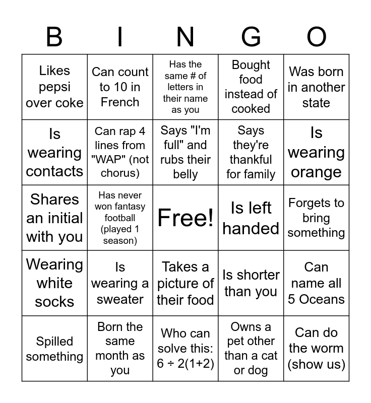 This bingo card has a free space and 24 words: Is wearing a sweater, Born the same month as you, Says "I'm full" and rubs their belly, Spilled something, Was born in another state, Likes pepsi over coke, Is wearing contacts, Can count to 10 in French, Is left handed, Takes a picture of their food, Says they're thankful for family, Shares an initial with you, Is shorter than you, Can name all 5 Oceans, Can rap 4 lines from "WAP" (not chorus), Owns a pet other than a cat or dog, Forgets to bring something, Has the same # of letters in their name as you, Is wearing orange, Has never won fantasy football (played 1 season), Can do the worm (show us), Wearing white socks, Bought food instead of cooked and Who can solve this: 6 ÷ 2(1+2).