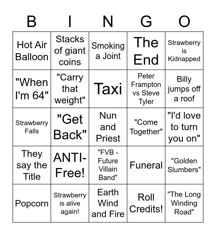 This bingo card has 25 words: ANTI-Free!, Earth Wind and Fire, Taxi, Popcorn, Strawberry is Kidnapped, Hot Air Balloon, "When I'm 64", Stacks of giant coins, "Come Together", "FVB - Future Villain Band", Peter Frampton vs Steve Tyler, Strawberry Falls, Funeral, "Golden Slumbers", "Carry that weight", "The Long Winding Road", "I'd love to turn you on", Smoking a Joint, Billy jumps off a roof, "Get Back", Nun and Priest, Strawberry is alive again!, They say the Title, The End and Roll Credits!.