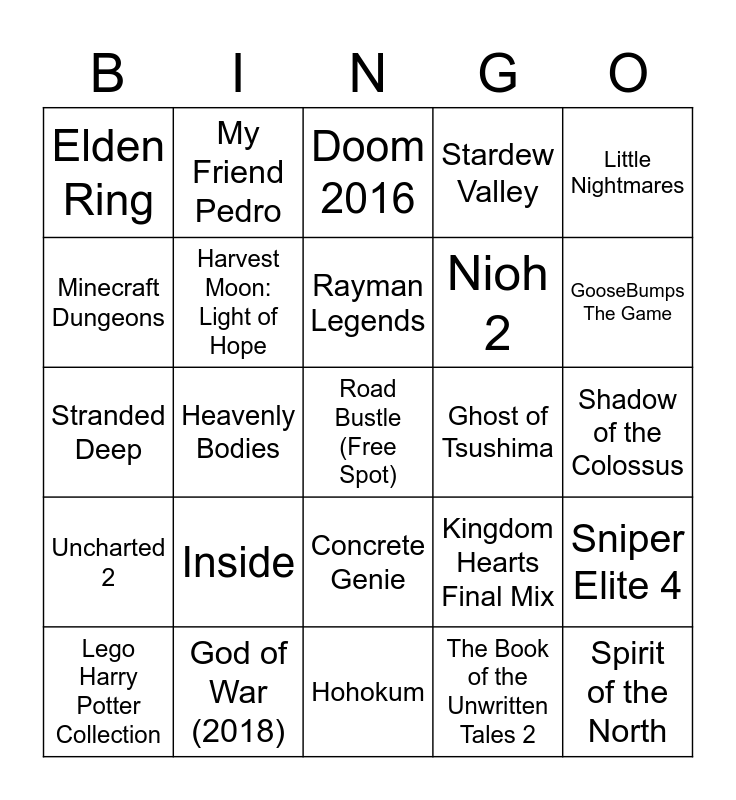 This bingo card has a free space and 24 words: Inside, God of War (2018), Rayman Legends, Lego Harry Potter Collection, Little Nightmares, Elden Ring, Minecraft Dungeons, My Friend Pedro, Ghost of Tsushima, Concrete Genie, Nioh 2, Stranded Deep, Kingdom Hearts Final Mix, Sniper Elite 4, Harvest Moon: Light of Hope, The Book of the Unwritten Tales 2, Shadow of the Colossus, Doom 2016, GooseBumps The Game, Heavenly Bodies, Spirit of the North, Uncharted 2, Stardew Valley and Hohokum.