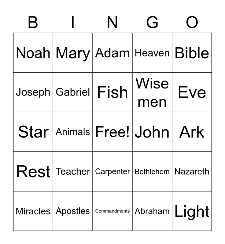 This bingo card has a free space and 24 words: Teacher, Apostles, Fish, Miracles, Bible, Noah, Joseph, Mary, John, Carpenter, Wise men, Star, Bethlehem, Nazareth, Gabriel, Abraham, Ark, Adam, Eve, Animals, Light, Rest, Heaven and Commandments.