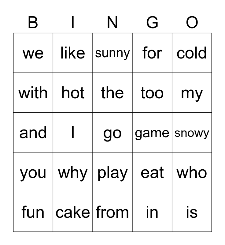 This bingo card has a free space and 24 words: why, cake, the, fun, cold, we, with, like, game, play, too, and, eat, who, hot, in, snowy, sunny, my, I, is, you, for and from.