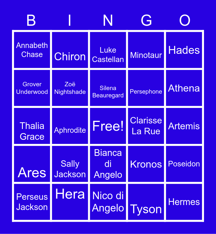 This bingo card has a free space and 24 words: Perseus Jackson, Sally Jackson, Silena Beauregard, Tyson, Hades, Annabeth Chase, Chiron, Luke Castellan, Clarisse La Rue, Artemis, Thalia Grace, Zoë Nightshade, Kronos, Poseidon, Grover Underwood, Hera, Nico di Angelo, Minotaur, Athena, Ares, Aphrodite, Bianca di Angelo, Persephone and Hermes.