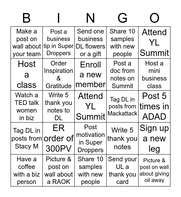 This bingo card has 25 words: ER order of 300PV, Share 10 samples with new people, Enroll a new member, Have a coffee with a biz person, Attend YL Summit, Make a post on wall about your team, Host a class, Post a business tip in Super Droppers, Tag DL in posts from Mackattack, Post motivation in Super Droppers, Post a doc from notes on Summit, Watch a TED talk women in biz, Write 5 thank you notes, Sign up a new leg, Order Inspiration & Gratitude, Picture & post on wall about giving oil away, Post 5 times in ADAD, Send one business DL flowers or a gift, Host a mini business class, Write 5 thank you notes to DL, Attend YL Summit, Picture & post on wall about a RAOK, Tag DL in posts from Stacy M, Share 10 samples with new people and Send your UL a thank you card.
