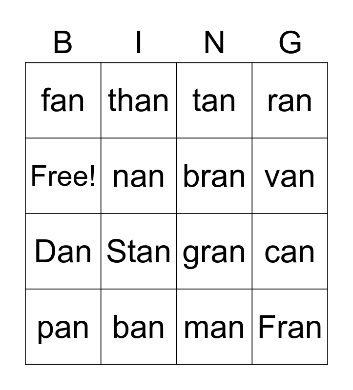 This bingo card has 16 words: ban, can, tan, fan, Dan, than, gran, man, Free!, nan, pan, ran, Stan, van, bran and Fran.